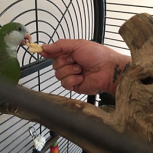 Ek het self 'n Quaker-papegaai te koop genaamd Beeb wat die huis oorgeneem het. Hy is baie rats in vlug en maak seker hy is in elke kamer waar daar mense is. Sy gunstelingplek is om eenvoudig op jou skouer te sit. Ek bring Beeb dikwels saam met my werk toe, so baie van ons kliƫnte het hom dalk al ontmoet.