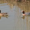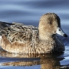 Anas penelope or European Widgeon Ducks are patterned ducks. Males sport an array of dramatic and fine stippling and striking stripes. The male European Widgeon has a chestnut head with a contrasting powder blue bill with a black tip. The breast is a rosy mauve, and the rest of the body is gray and dark brown with striking black and white highlights. The female European Widgeon is mottled in camouflaging browns and grays. When not in breeding plumage, the male looks similar to the female.
