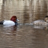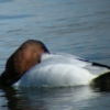 During the breeding season, male Canvasback Ducks have richly colored rust red heads, black necks and chests, and white textured wings, from which the name Canvasback came. They have red eyes, black bills, and grayish blue legs and feet. Females have a lighter, chestnut brown head, are lighter in color overall, and have more mottling throughout their feathering. Males are slightly larger than females.