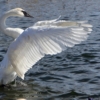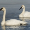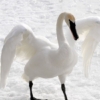 Trumpeter Swans are big, beautiful, and unusual birds. With snowy white feathers and black beaks, they would be eye-catching at any size, but as the largest native waterfowl of North America, these birds are awe-inspiring. Fully grown Trumpeters have white feathers and black beaks with a small, bright, salmon-colored streak along the mouthline. Males, called cobs, can weigh up to 35 pounds and have a wing span of as much as seven feet! Females are only slightly smaller and are called pens. Their babies, called cygnets, never spend more than one day in the nest after hatch and will live with Mom and Dad for one year before finding their own territory to nest in.