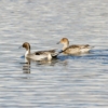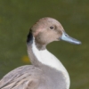 The Pintail drake has long, black, central tail feathers that come to a point, giving rise to the name “pintail.” Drakes also have a white neck and underparts, a chocolate brown head, and lighter brown backs and wings. Hens are duller-colored and lack the bright white stripe. They are brown and white mottled. Both sexes have grey bills, legs, and feet, and a graceful silhouette.